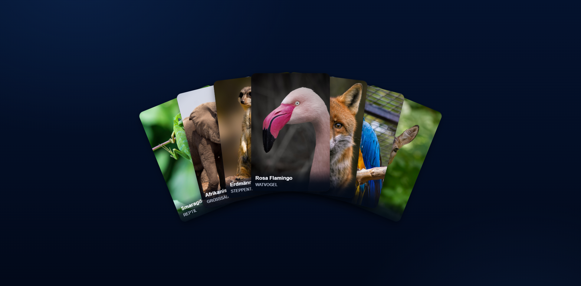 Die Interaktive Kartengalerie ist eine UI-Komponente mit fächerförmigem Kartenlayout und einer großzügigen Fokusansicht pro Karte. Ziel war eine starke visuelle Wirkung bei gleichzeitig klarer Bedienlogik.